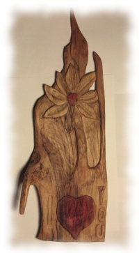 AUTORE: LINO LATTANZI ANNO: 2016 TIPOLOGIA: scolpito su una vecchia scaglia di legno di quercia trovata a Scai SOGGETTO: Dedicato ad Angela per il S. Valentino 2016