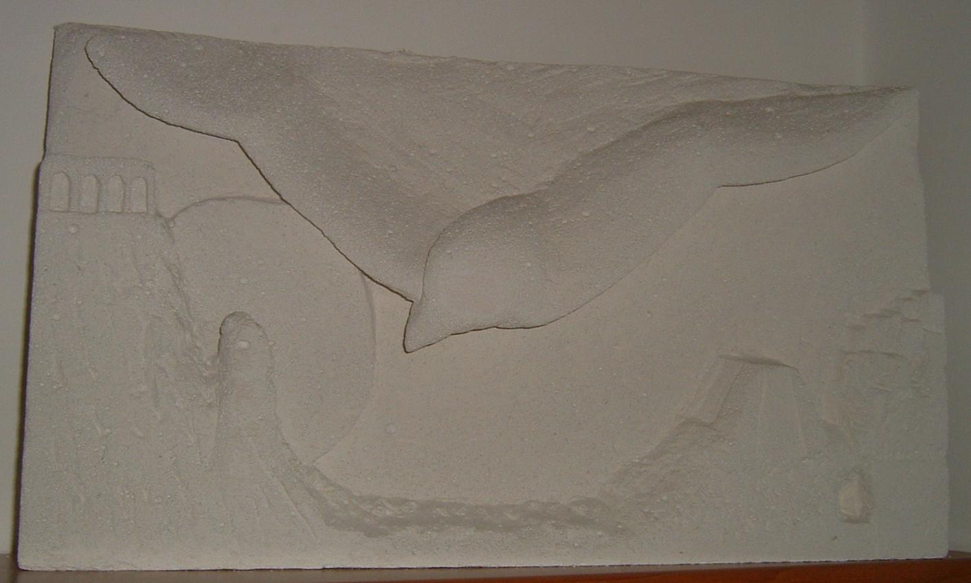 AUTORE: LINO LATTANZI ANNO: 1996 TIPOLOGIA: scultura su siporex SOGGETTO: Una vista fantasiosa del gabbiano tra Terracina (Anxur) e Sperlonga