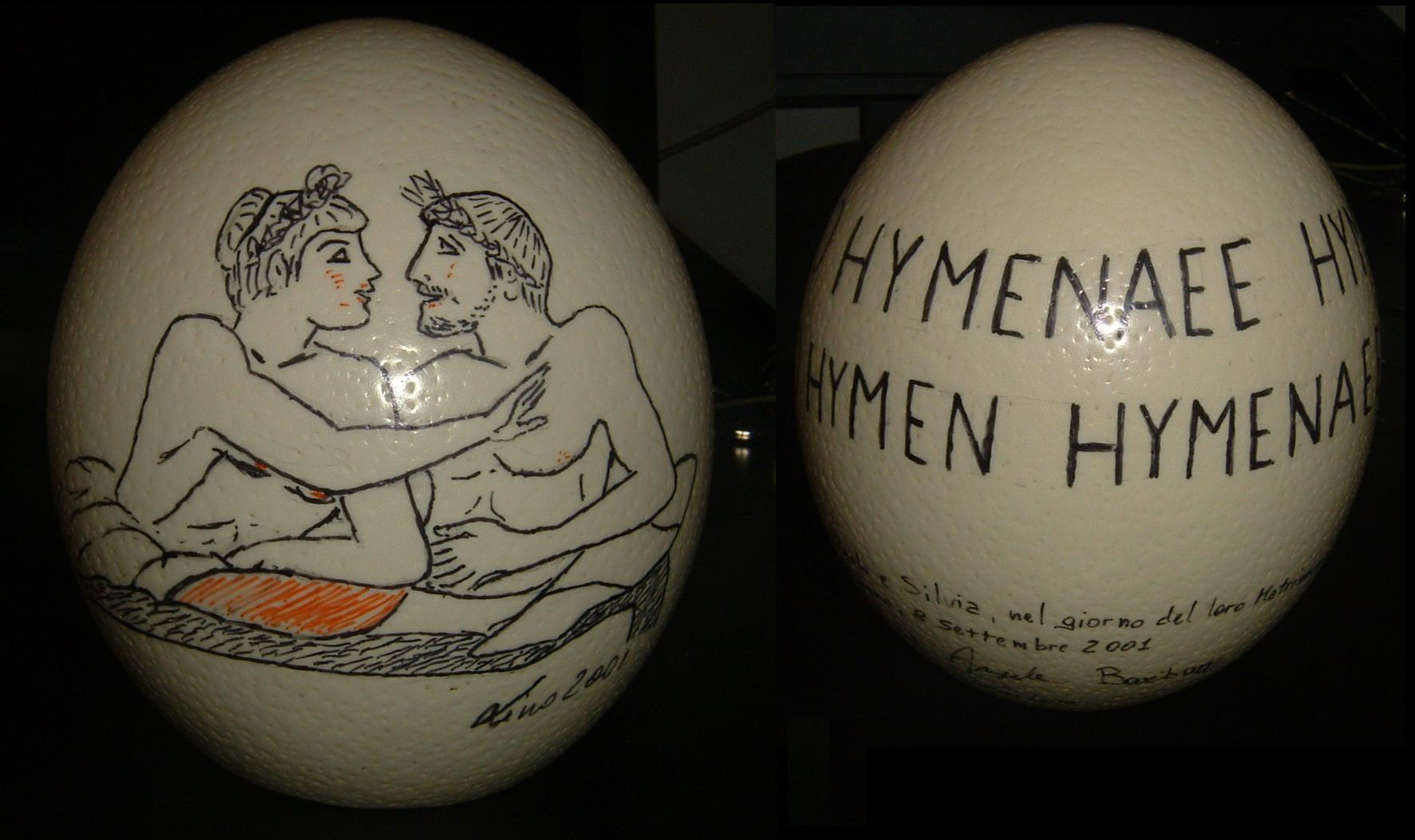 AUTORE: LINO LATTANZI ANNO: 2001 TIPOLOGIA: disegno in china su uovo di struzzo SOGGETTO: HYMENEE HYMEN... a ricordo delle nozze di Paolo